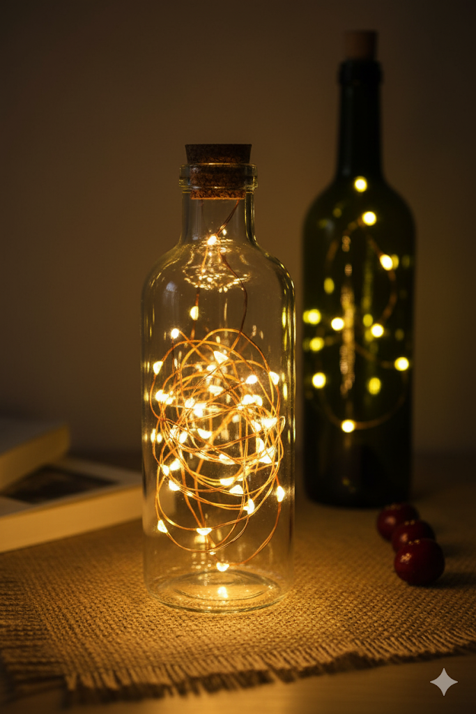 Transform ordinary bottles and jars into cozy mood lighting with these Cork Bottle String Lights. Flexible copper-wire fairy lights with warm-white micro-LEDs tuck neatly through a cork cap to create elegant, reusable bottle lamps — perfect for weddings, romantic dinners, bedroom accents, cafés, and seasonal décor. Battery/USB powered for easy tabletop placement and instant ambience. Lightweight, safe, and endlessly stylish — turn any empty bottle into a glowing centerpiece.